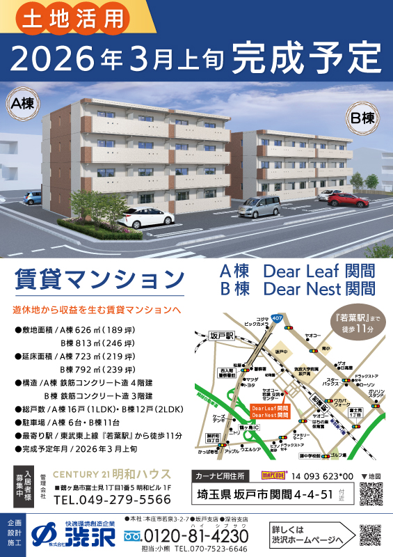 賃貸マンション『Dear Leaf関間・Dear Nest関間』3月上旬 完成予定<埼玉県坂戸市>
