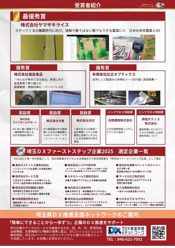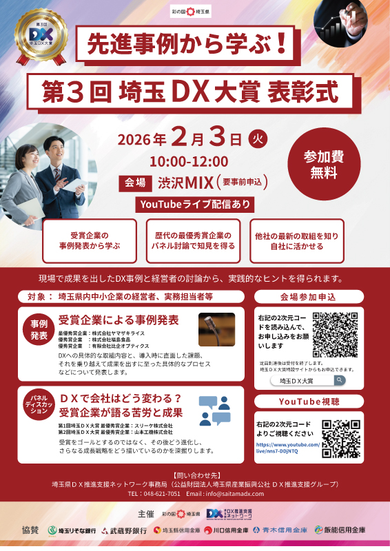「埼玉DX大賞」は、埼玉県と埼玉県DX推進支援ネットワークにより、県内中小企業等の優れたDXへの取組を表彰するものです。