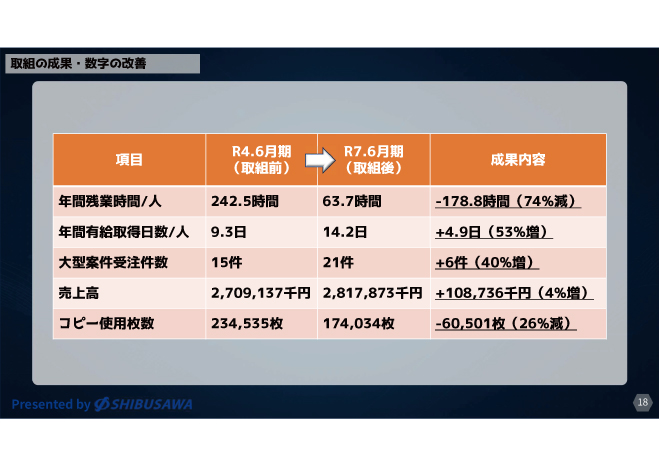 成果として、定量面では、残業時間の削減、有給取得日数の増加が明確に表れました。