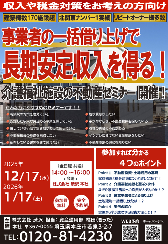 1/17『介護福祉施設の不動産セミナー』㈱渋沢 資産運用部<埼玉県本庄市>